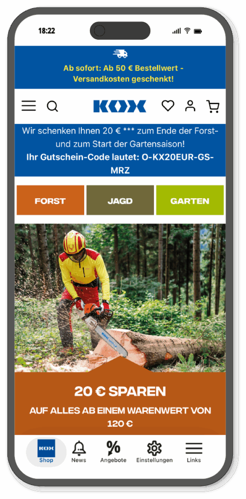 Neben dem Onlineshop bieten wir Ihnen auch eine eigene native Shopping App an – nicht bloß eine Progressive Web App (PWA). Ohne eine eigene App programmieren zu müssen, geht Ihr Shop im Hosentaschenformat schnell online und steigert Ihren Umsatz.